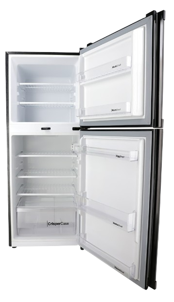 DAWLANCE REFRIGERATOR 9140 WB PEARL RED Non-Inverter, Direct Cool refrigerator in black with pearl red door, top freezer, hidden plastic handle, control system, and door lock. Interior: 3 wire shelves, 3 refrigerator door pockets, 2 freezer door pockets, 1 crisper, ceiling LED light, 1 egg tray, icebox (21 pcs). Energy & Performance: 230V, 50–60Hz, Climate Class T. Dimensions: 144.4×58×56 cm (56.85×22.83×22.05 in).